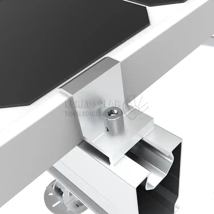 Средний зажим устанавливается в середине массива и одновременно зажимает внутренние рамы двух соседних компонентов, воспринимая силу, передаваемую двумя соседними компонентами. В основном он противостоит подъемной силе восходящего ветра. Оба конца среднего зажима открыты и используются для удержания панели.